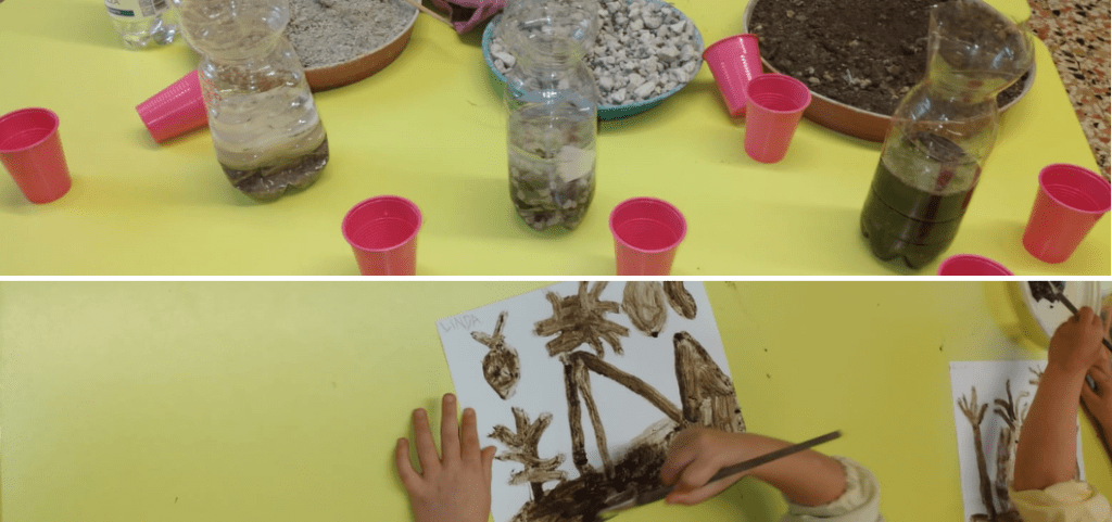 Cosa succede se si rovescia dell’acqua dentro a un recipiente pieno di terra? E se fosse pieno di sabbia o sassi? Per noi adulti è banale saperlo ma è stato meraviglioso oggi vedere i volti sorpresi dei bambini. E alla fine tutti hanno disegnato con la terra:
